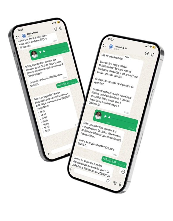 - A IA conversa com o paciente via WhatsApp e agenda consultas diretamente no Clinicalup.